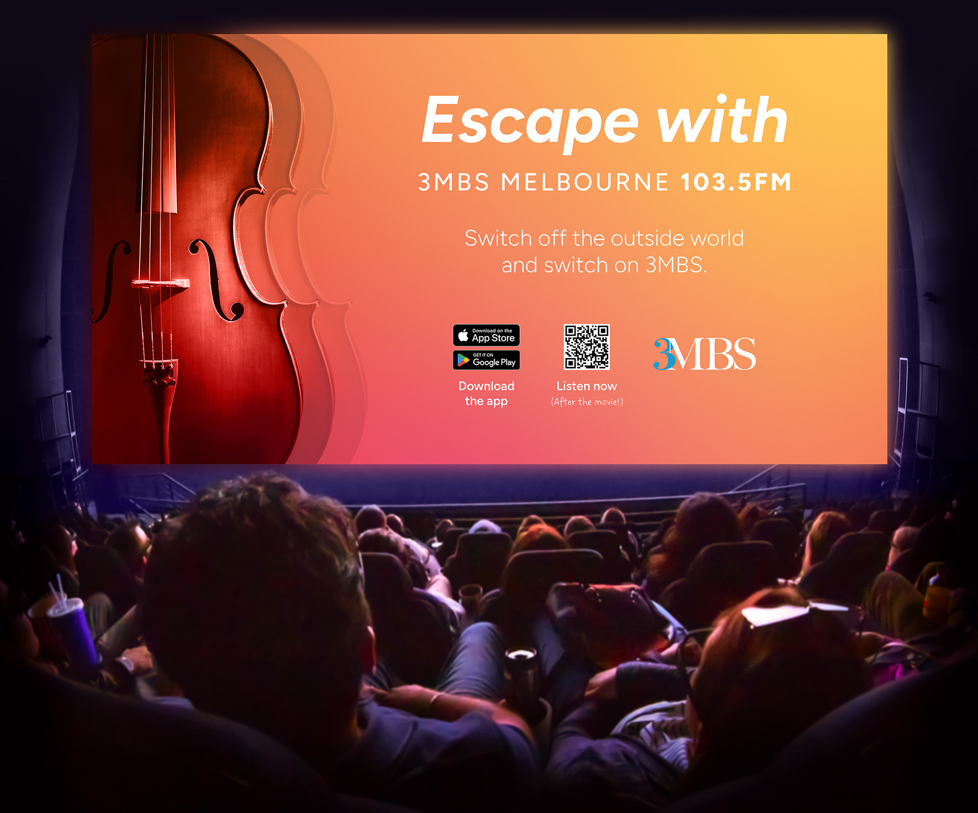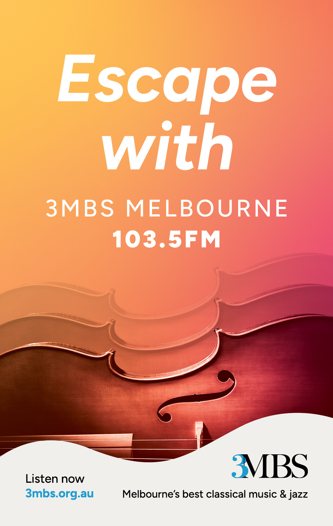 3MBS wanted to take their new brand messaging to the streets of Melbourne, and asked me to build a set of tram banners. They needed to be clean, colourful and easily read. The classical music theme was immediately recognisable through the sculpted curves of a cello, with vibrant background gradients and minimal typography to help communicate their offering. I also created a matching ad for Cinema Nova.