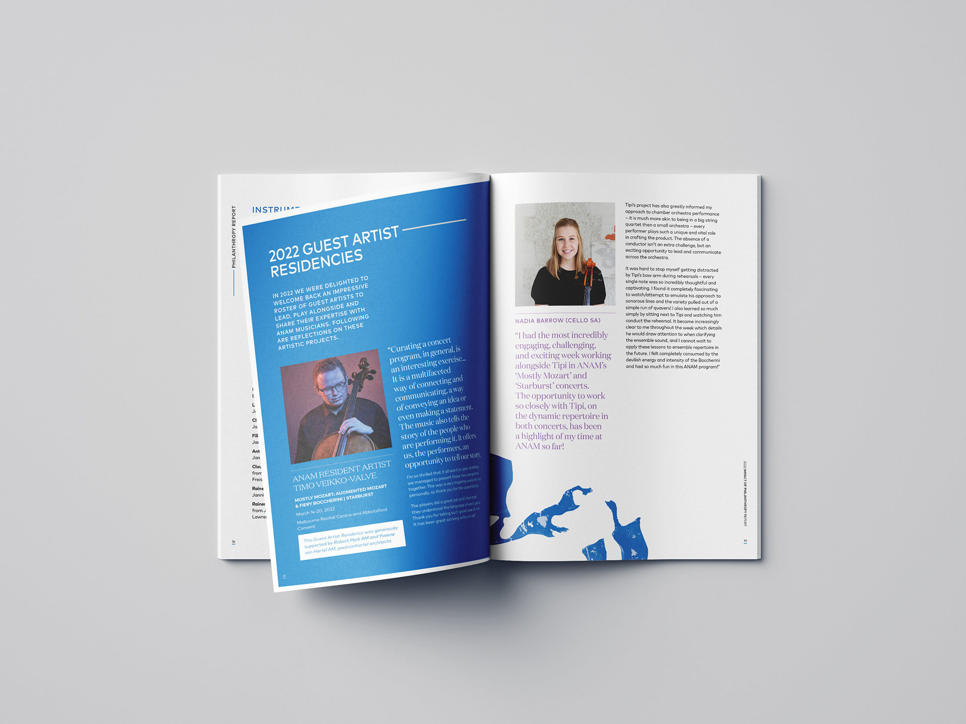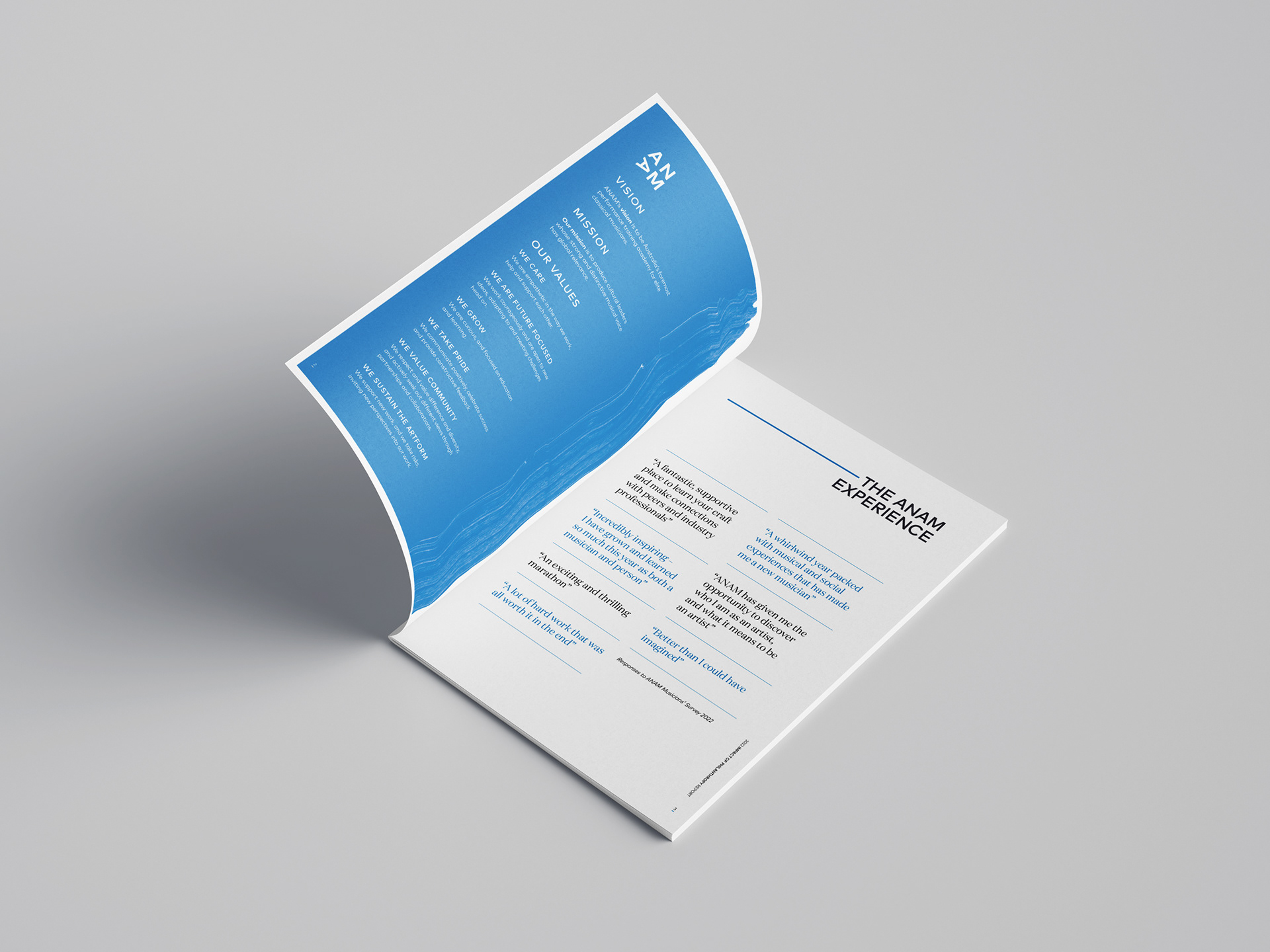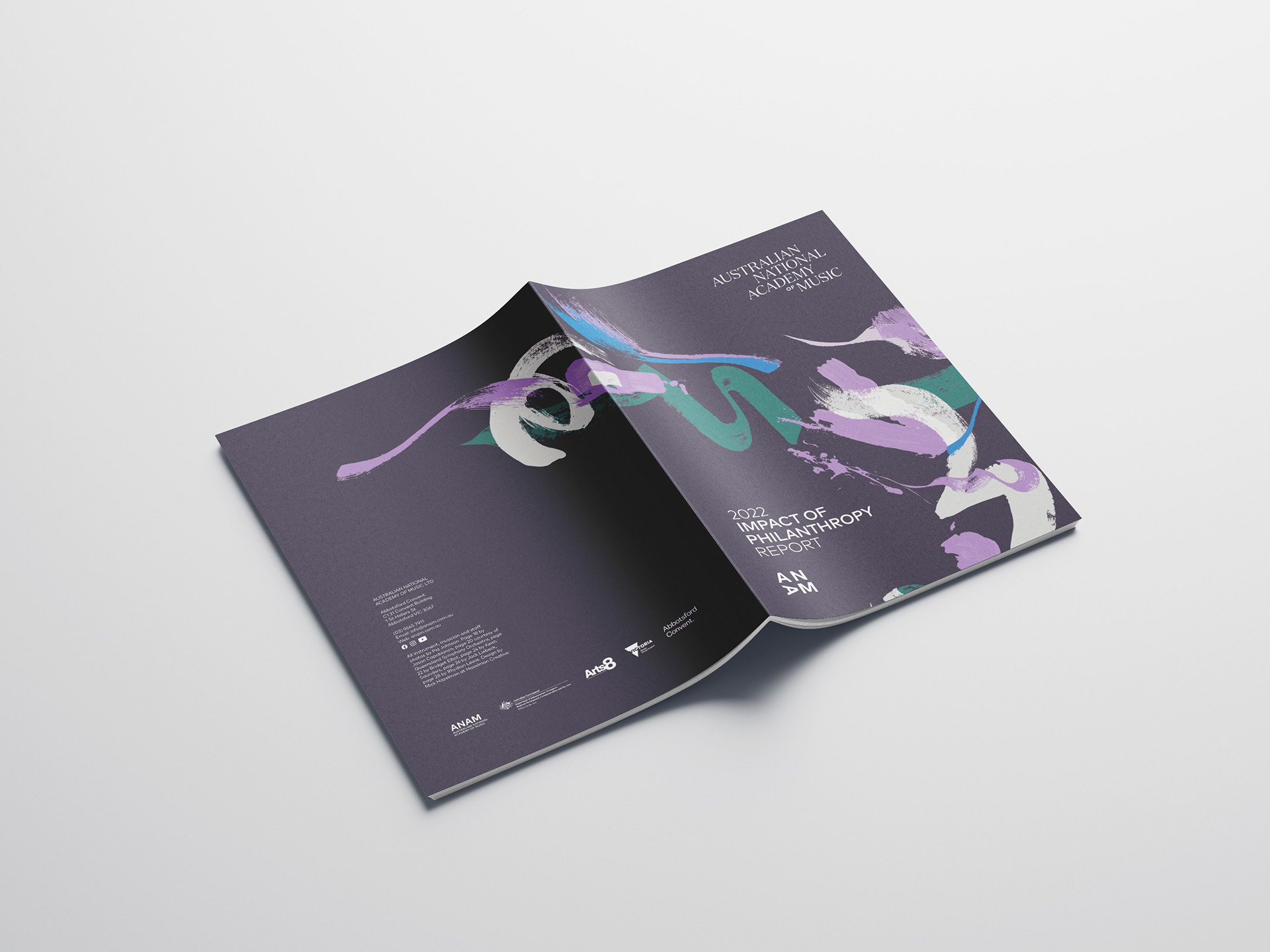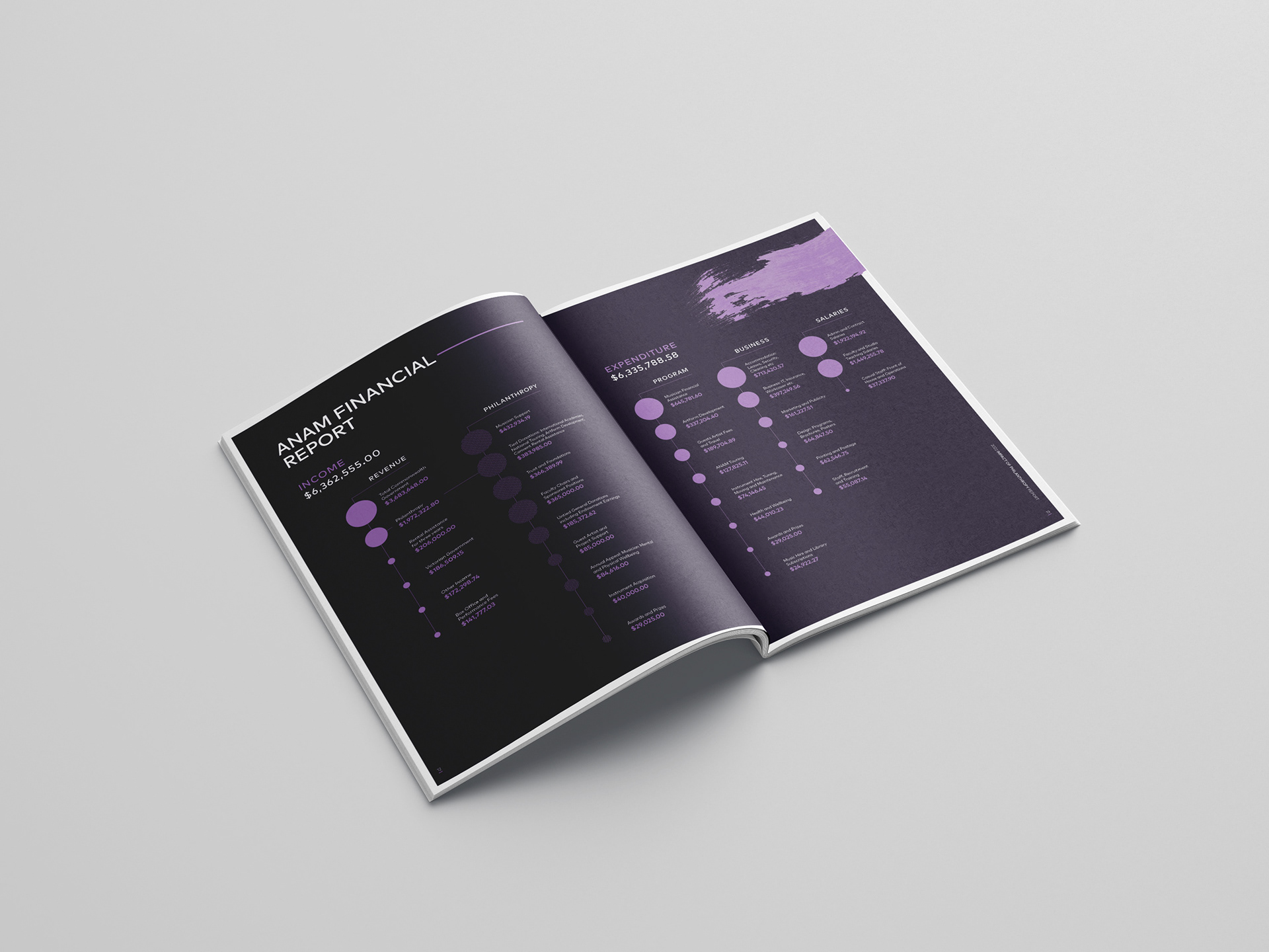 The 2022 version of ANAM's Impact Report featured the year's events, partnerships and financials – with paint splash assets courtesy of Studio Brave.