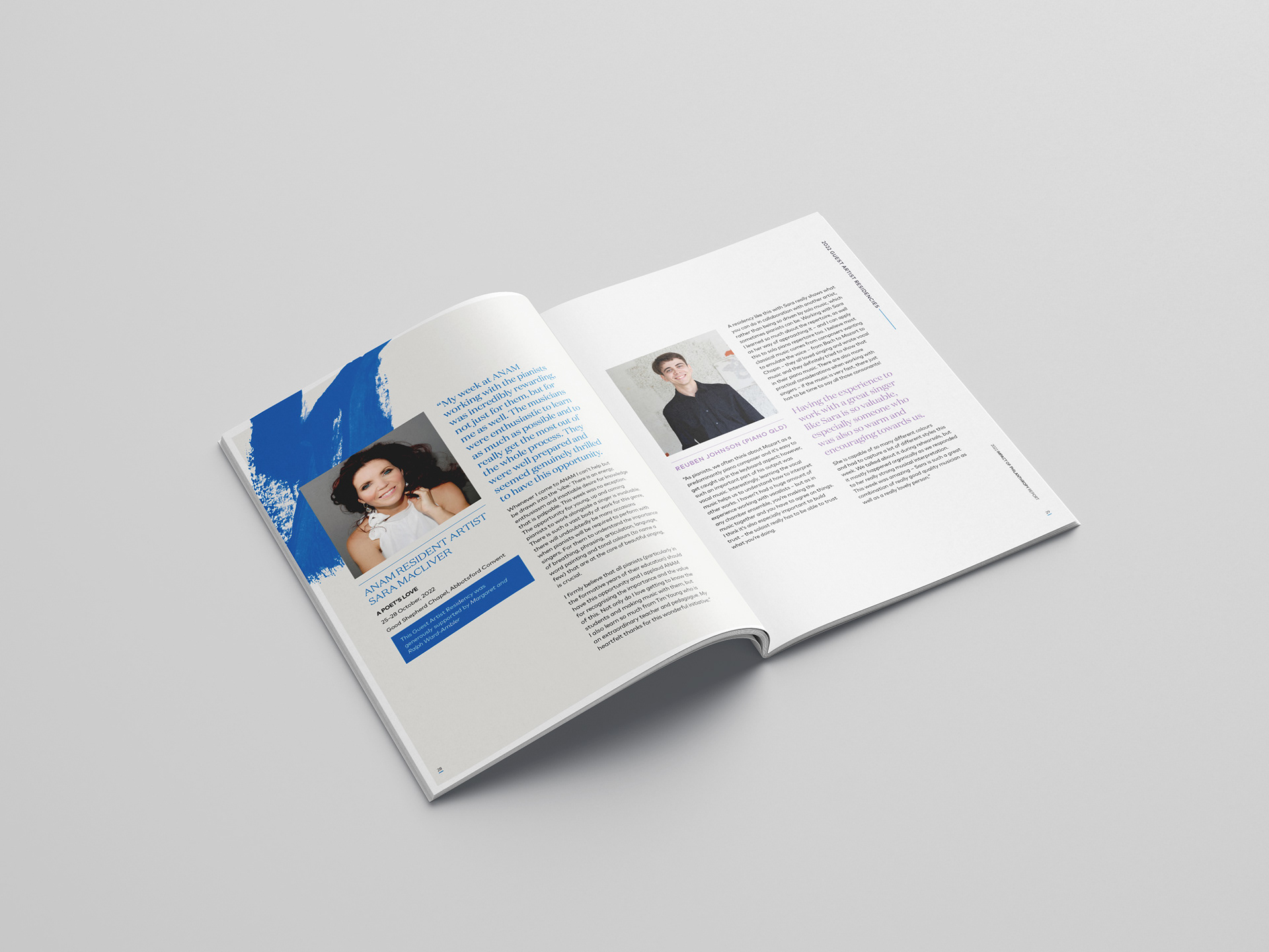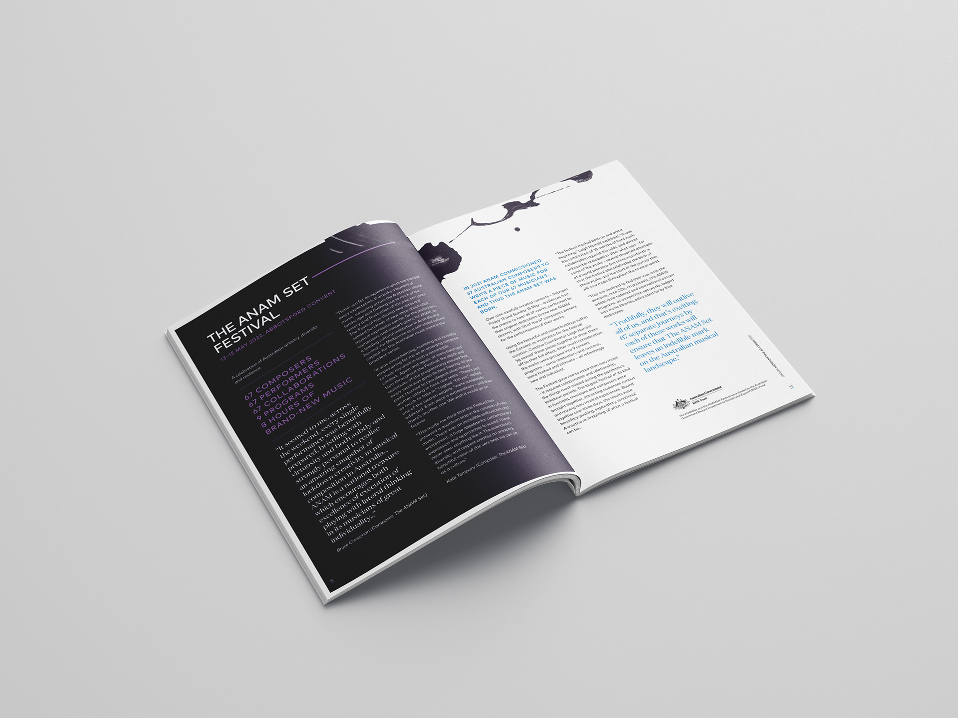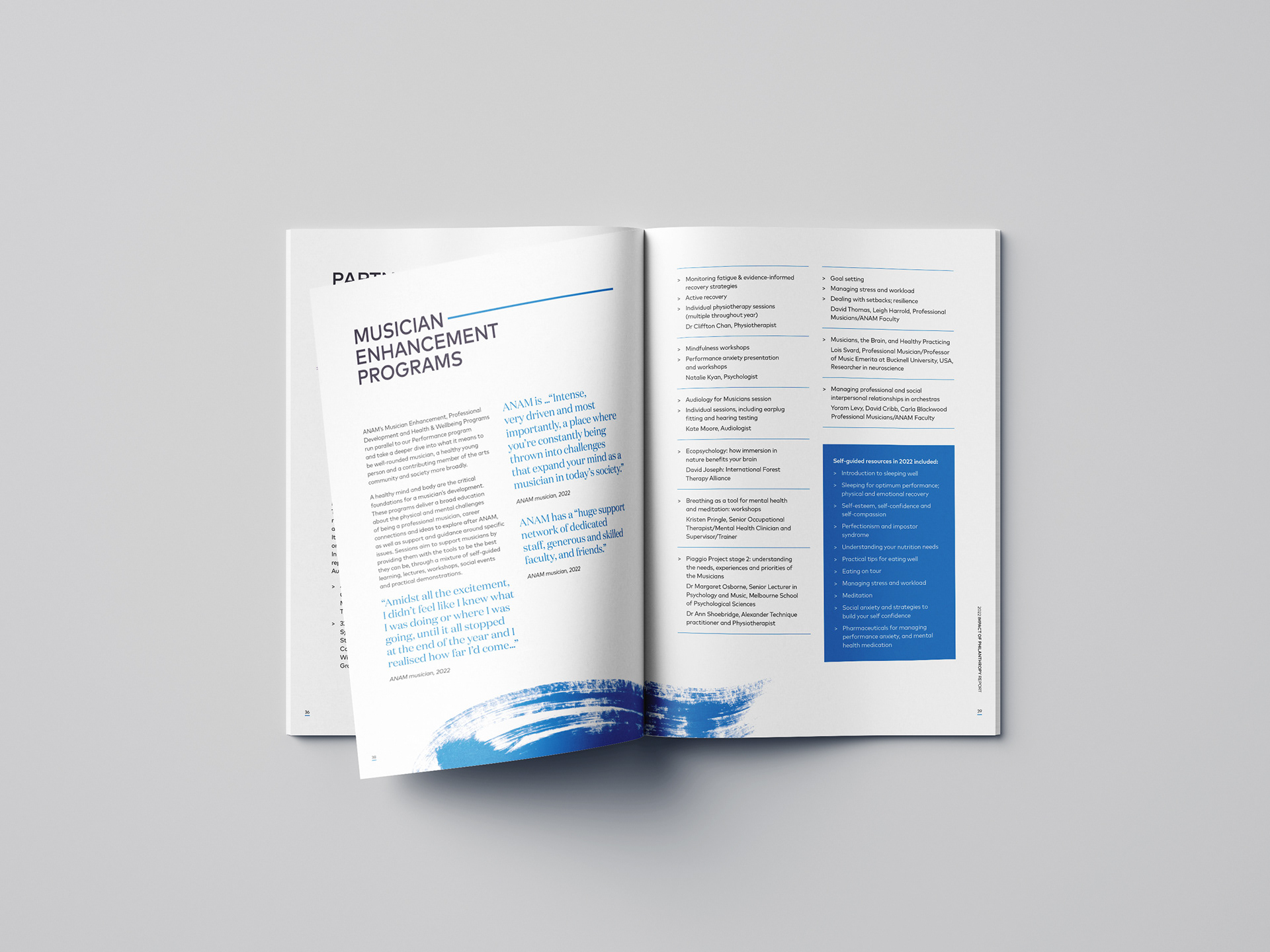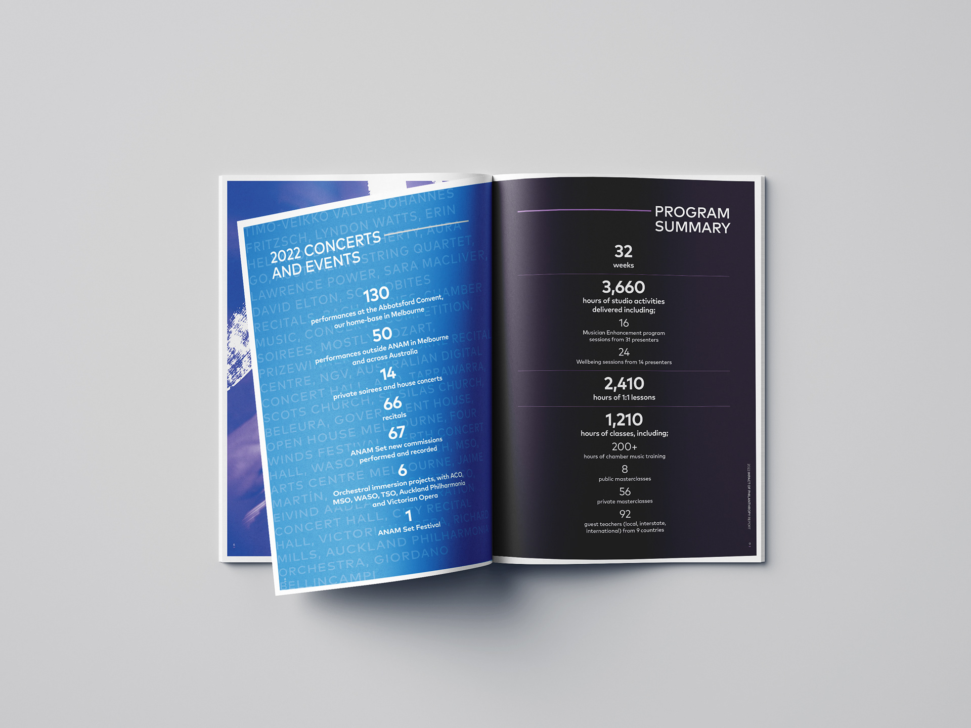 The 2022 version of ANAM's Impact Report featured the year's events, partnerships and financials – with paint splash assets courtesy of Studio Brave.