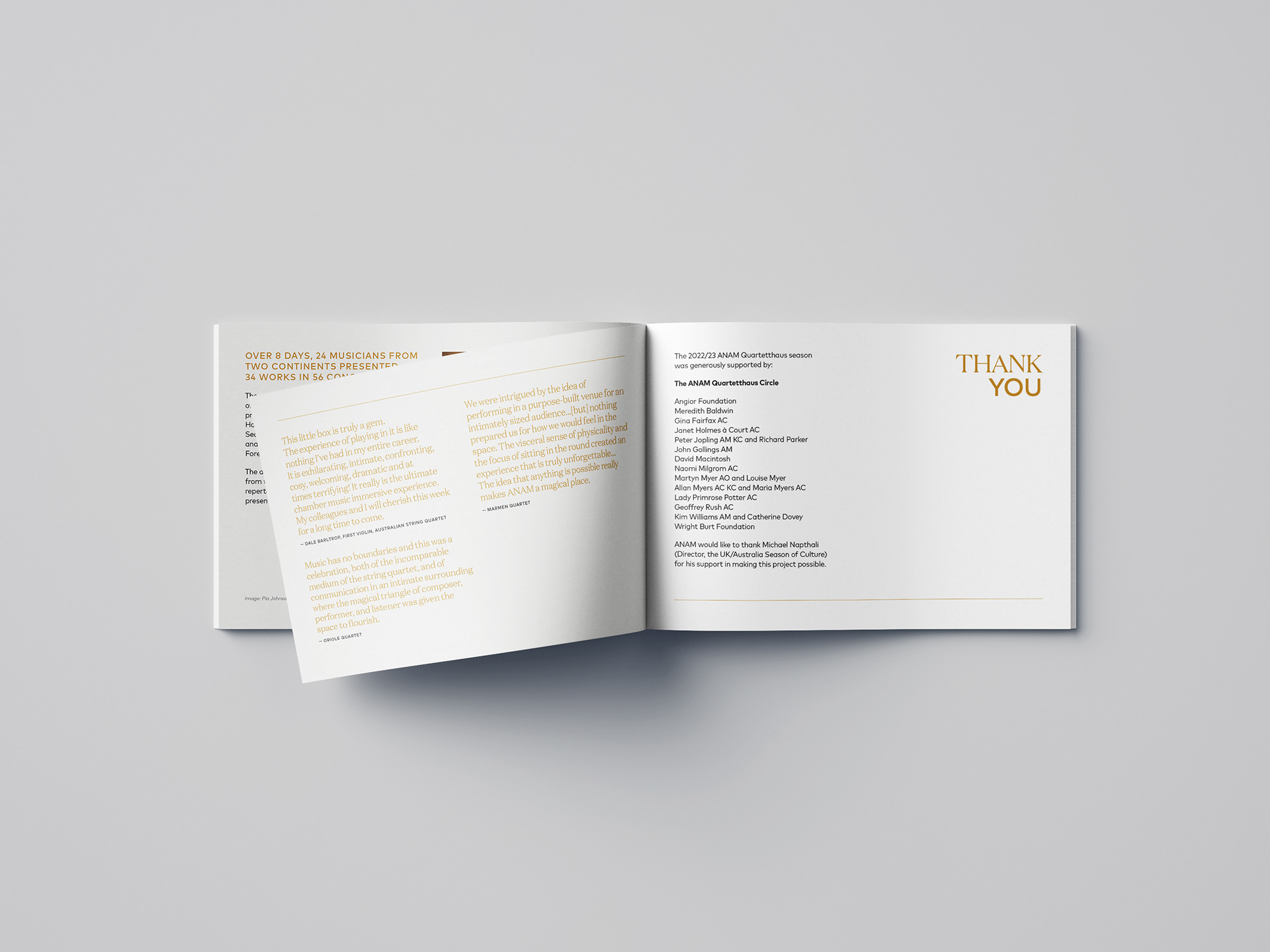 In 2023, ANAM presented the ANAM Quartetthaus at Melbourne Museum. A beautiful 10m x 10m timber cube, the Quartetthaus is a boutique, portable listening space that seats 52 patrons around a central performance space showcasing world-class string quartets. This A5 thankyou booklet acknowledged those that made it all possible. (Style guide and paint splashes courtesy of Studio Brave).