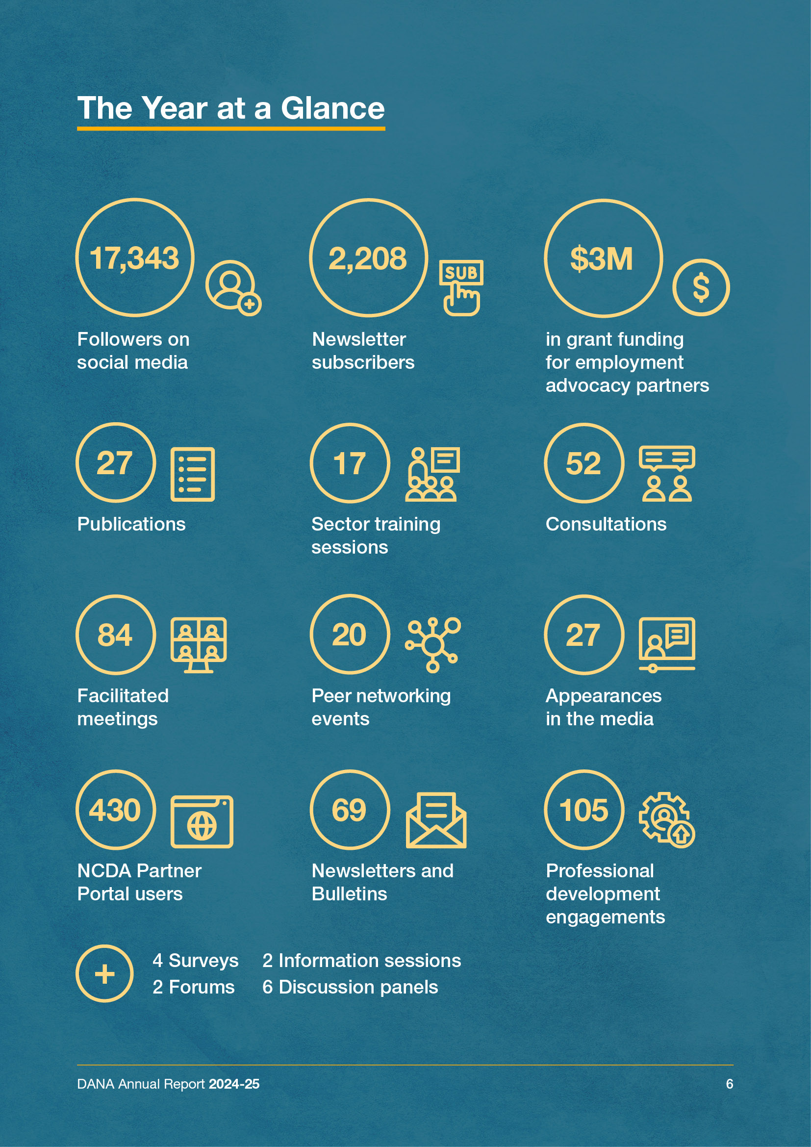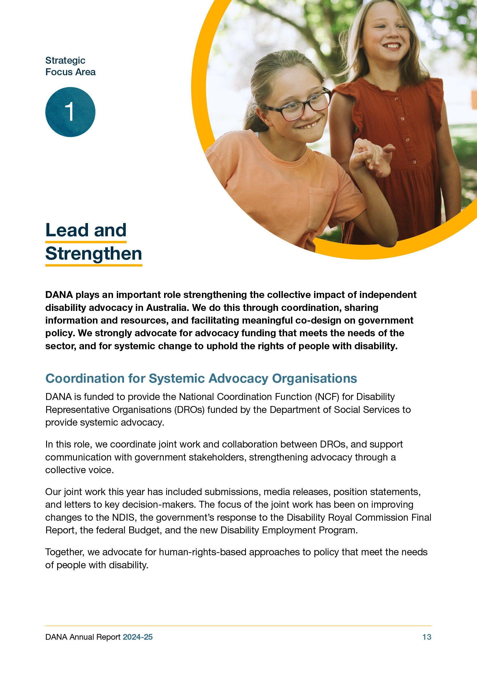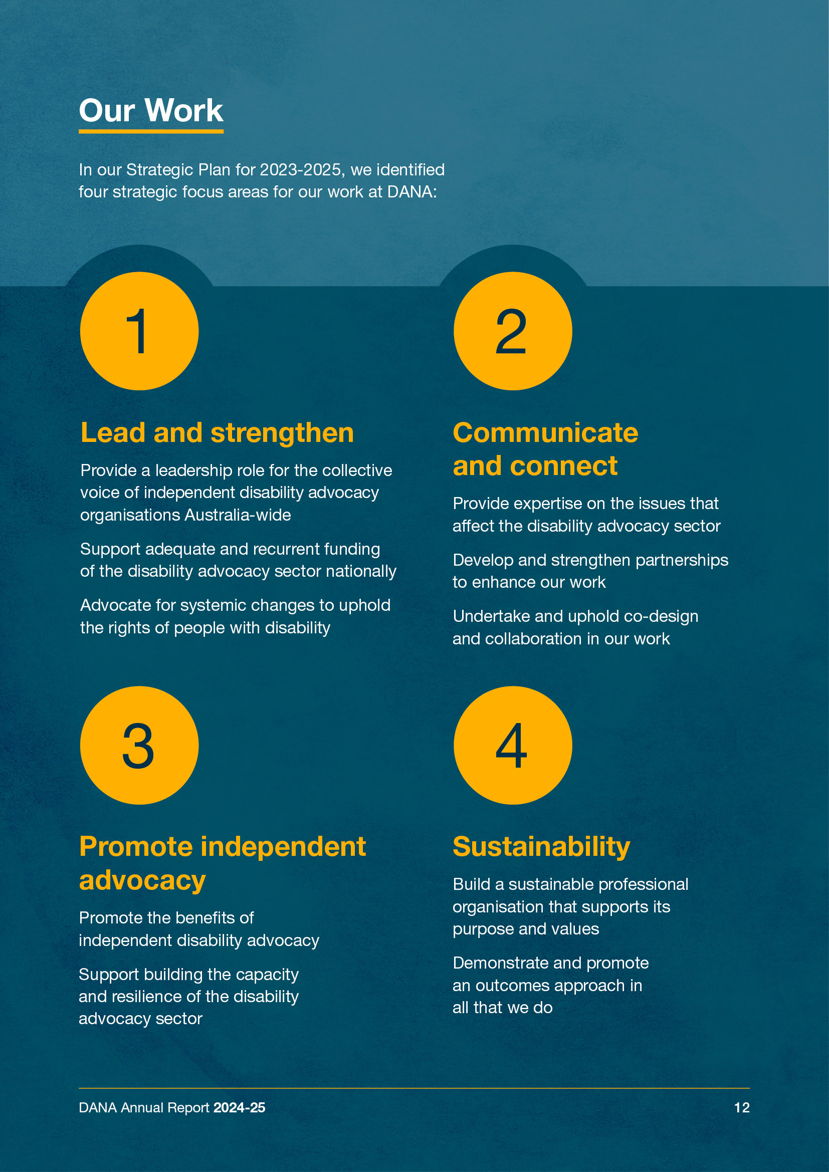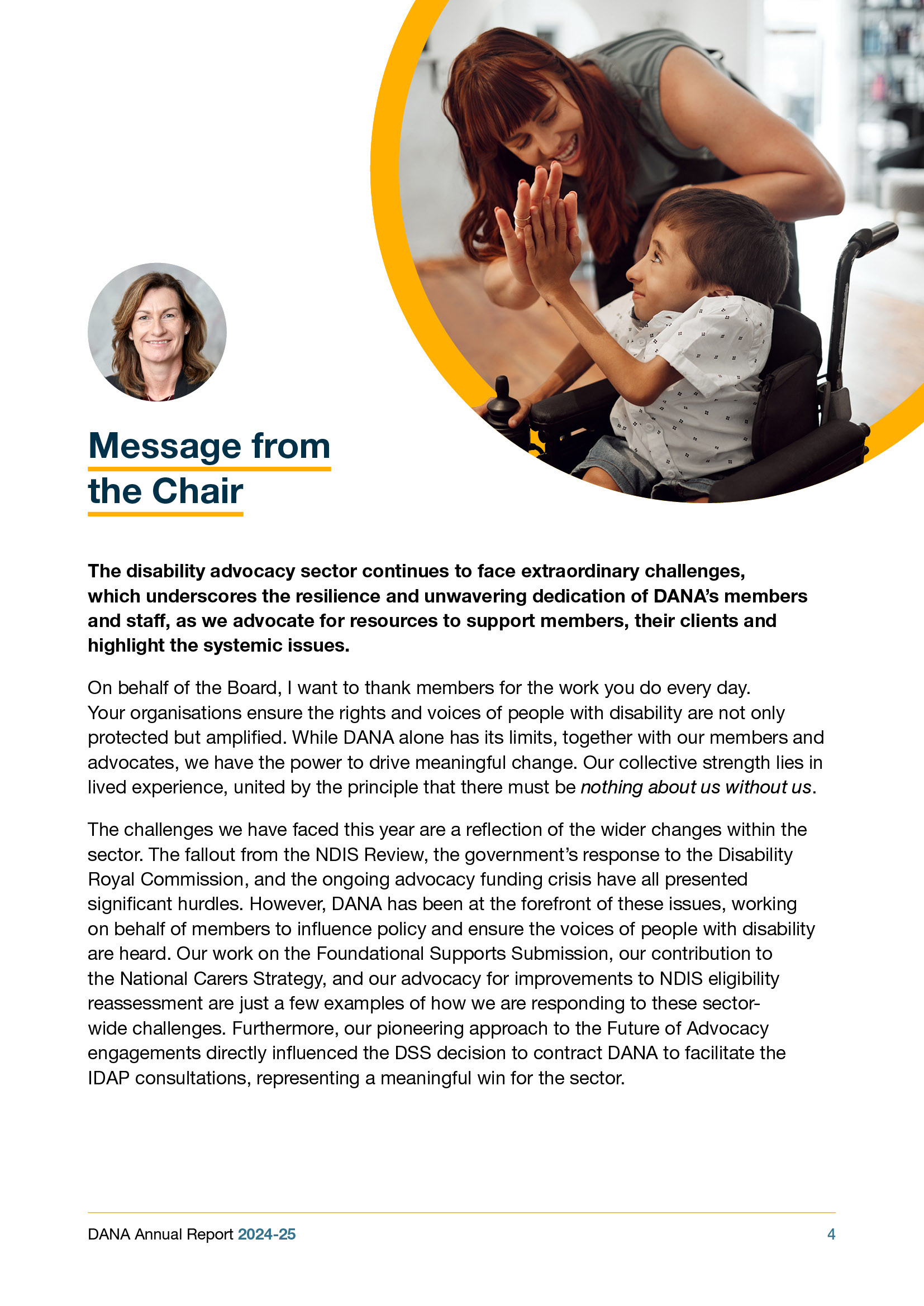 The Disability Advocacy Network Australia (DANA) asked me to put together their annual report for 2024-25. The brief was for single-page format, fully accessible and highlighting the great work they do in the Australian disability space. A circular theme featured throughout the report, with hero images contoured and protruding from the pages to help add life to this text-heavy document.