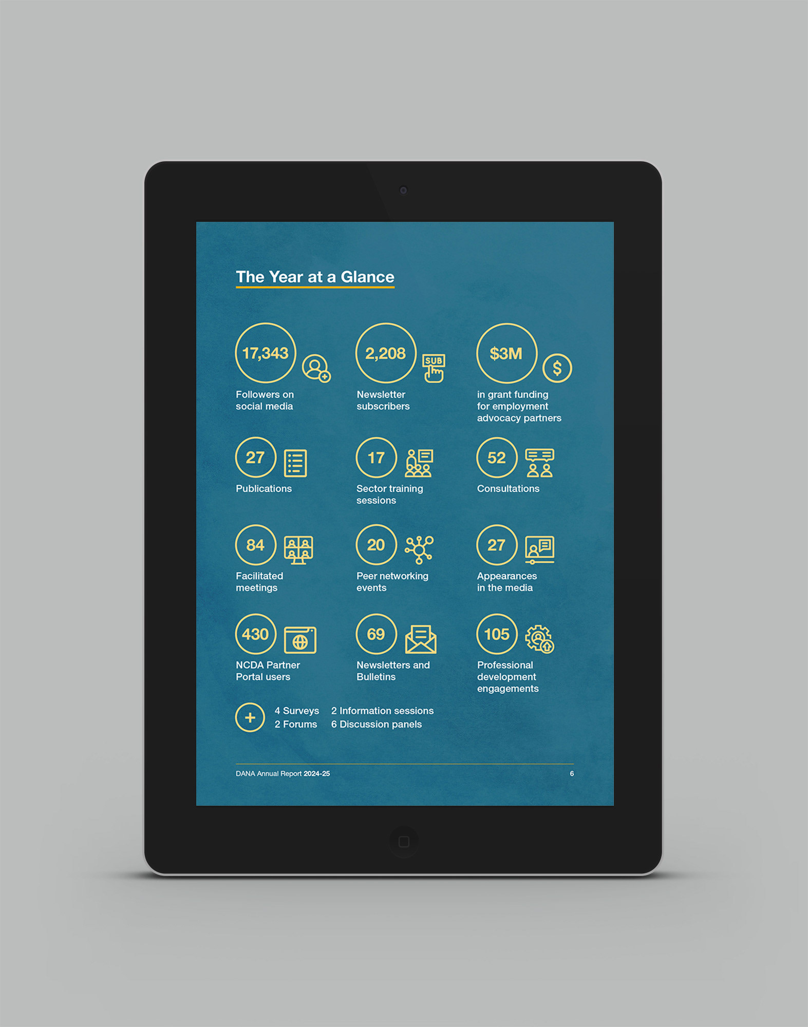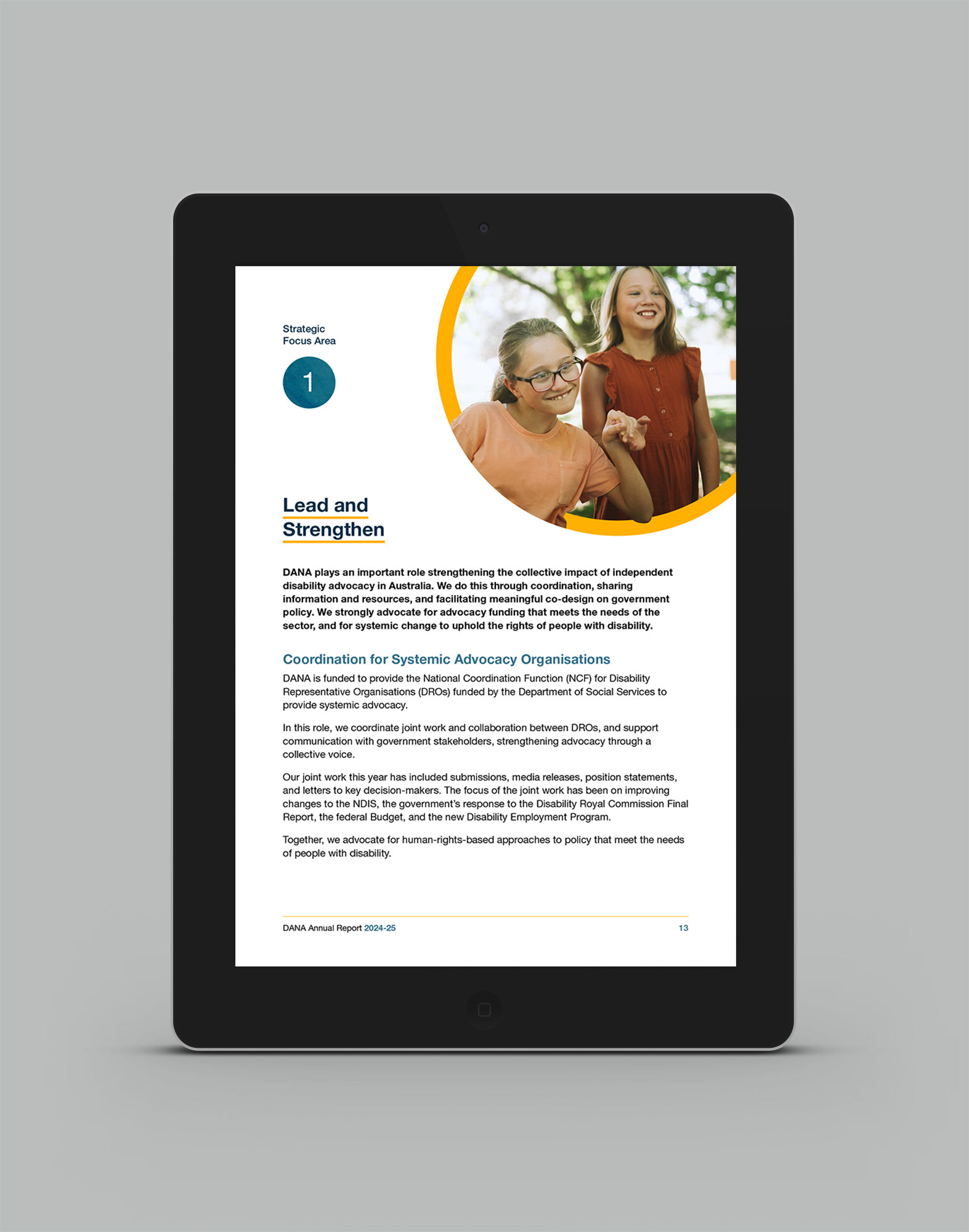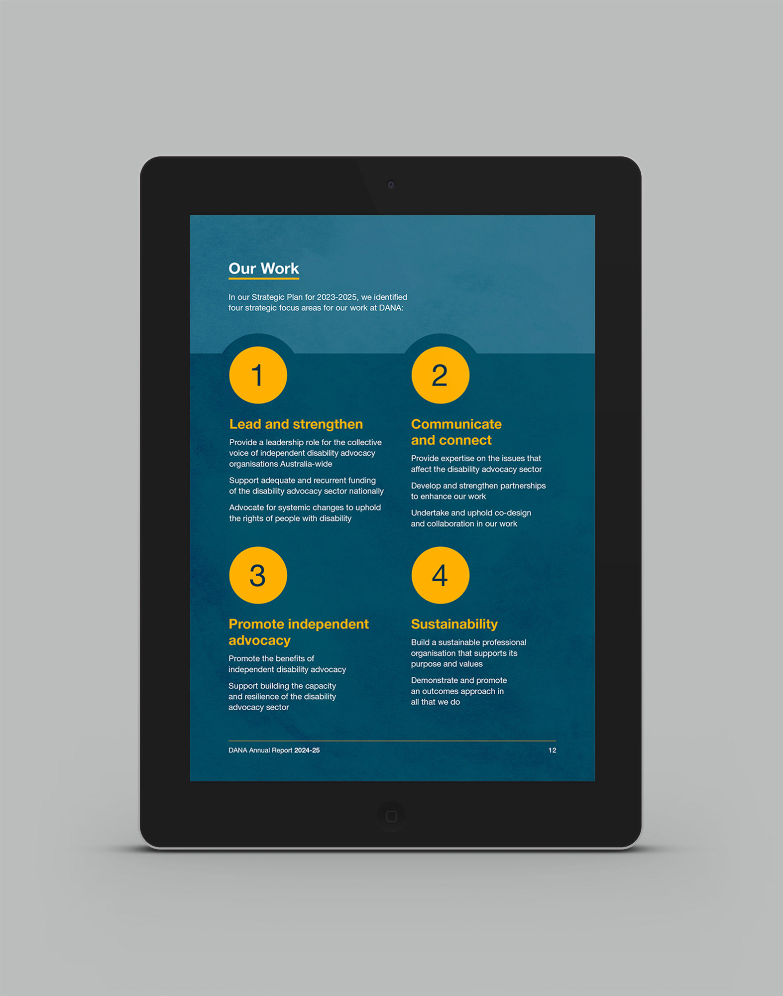 The Disability Advocacy Network Australia (DANA) asked me to put together their annual report for 2024-25. The brief was for single-page digital format, fully accessible and highlighting the great work they do in the Australian disability space. A circular theme featured throughout the report, with hero images contoured and protruding to help bring life to the pages.